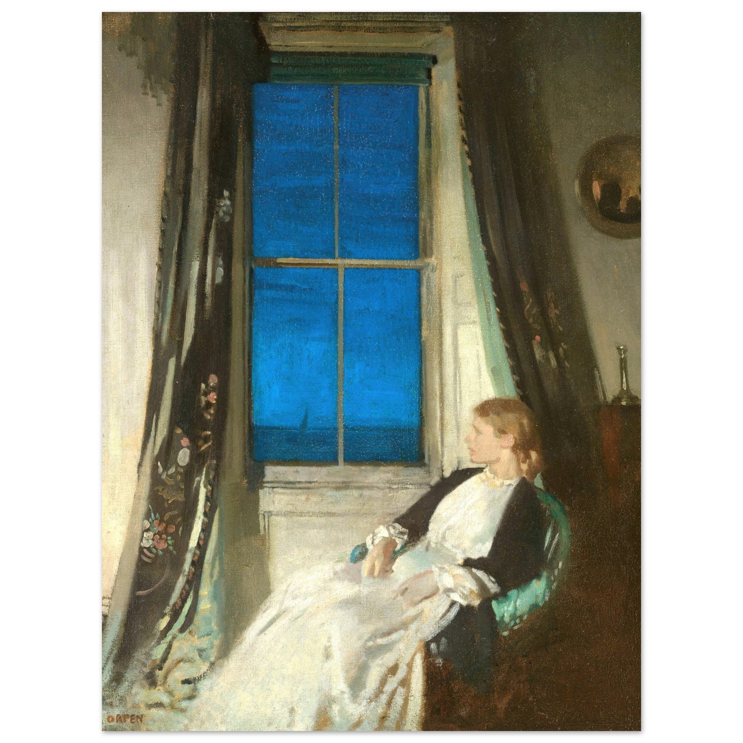 Orpen’s ability to blend formalism with emotion shines in this artwork. While the setting is a minimalist interior, the composition evokes a profound sense of mystery and longing. The subtle play of light and shadow, the cool tones of the night sky, and the delicately patterned drapes all come together to create a timeless aesthetic that will add a sophisticated touch to any room.