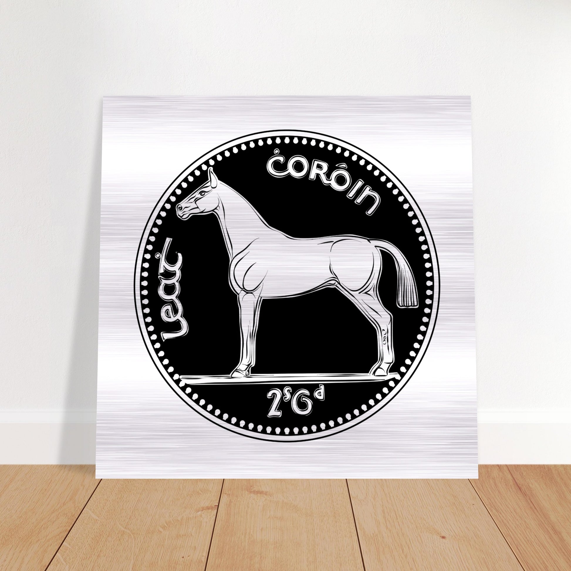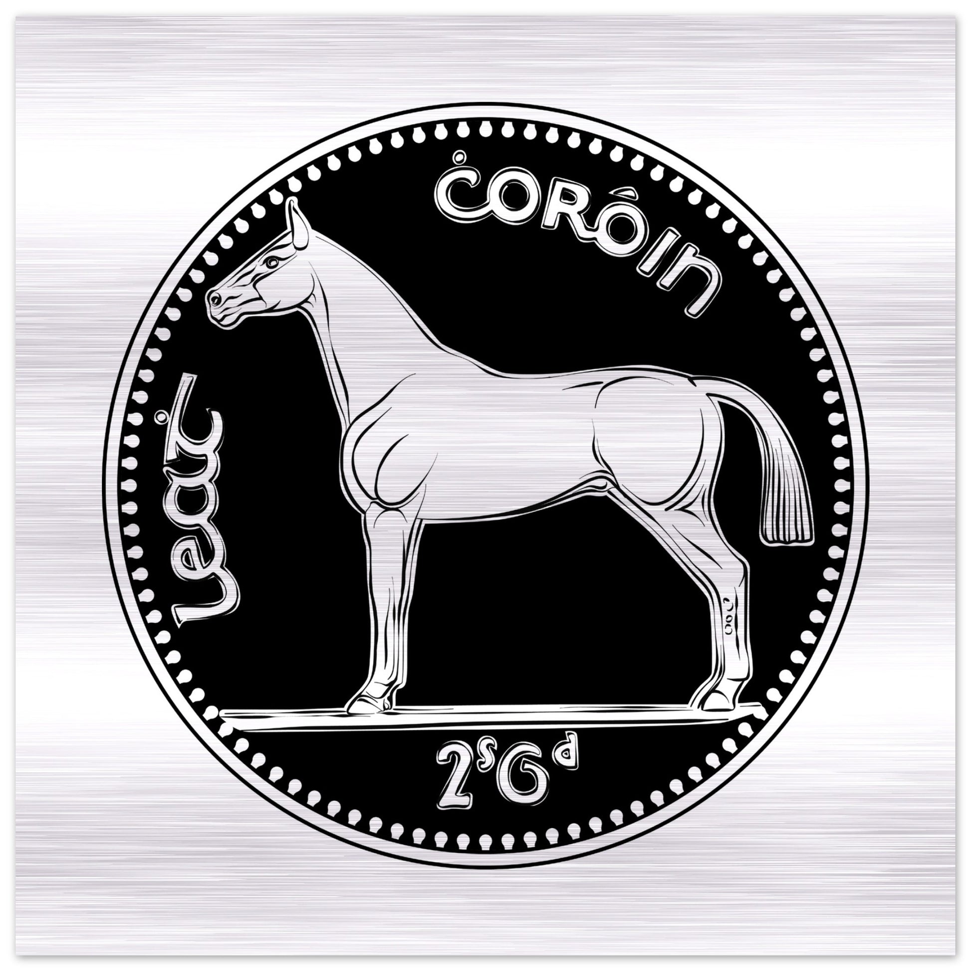 Discover the allure of Irish heritage with our Pre-decimal Half Crown Coin adorned with the majestic Irish Horse on its reverse side, now immortalized in a mesmerizing brushed aluminum print. Crafted on a silver brushed aluminum DIBOND® panel, also known as AluDibond Butler Finish Silver, these prints redefine artistry by infusing depth and texture into every intricate detail.