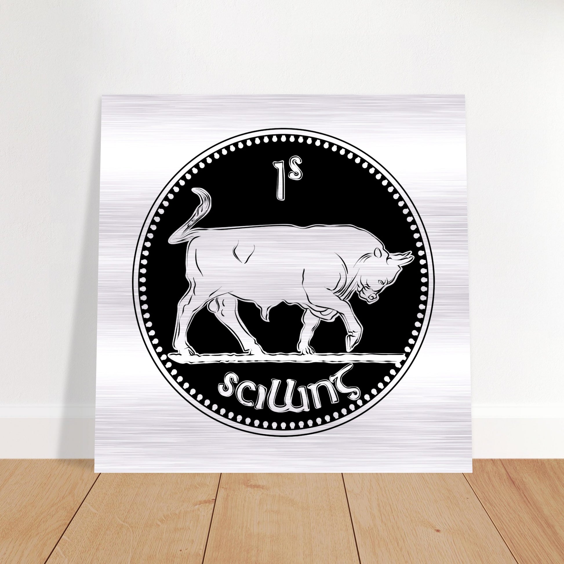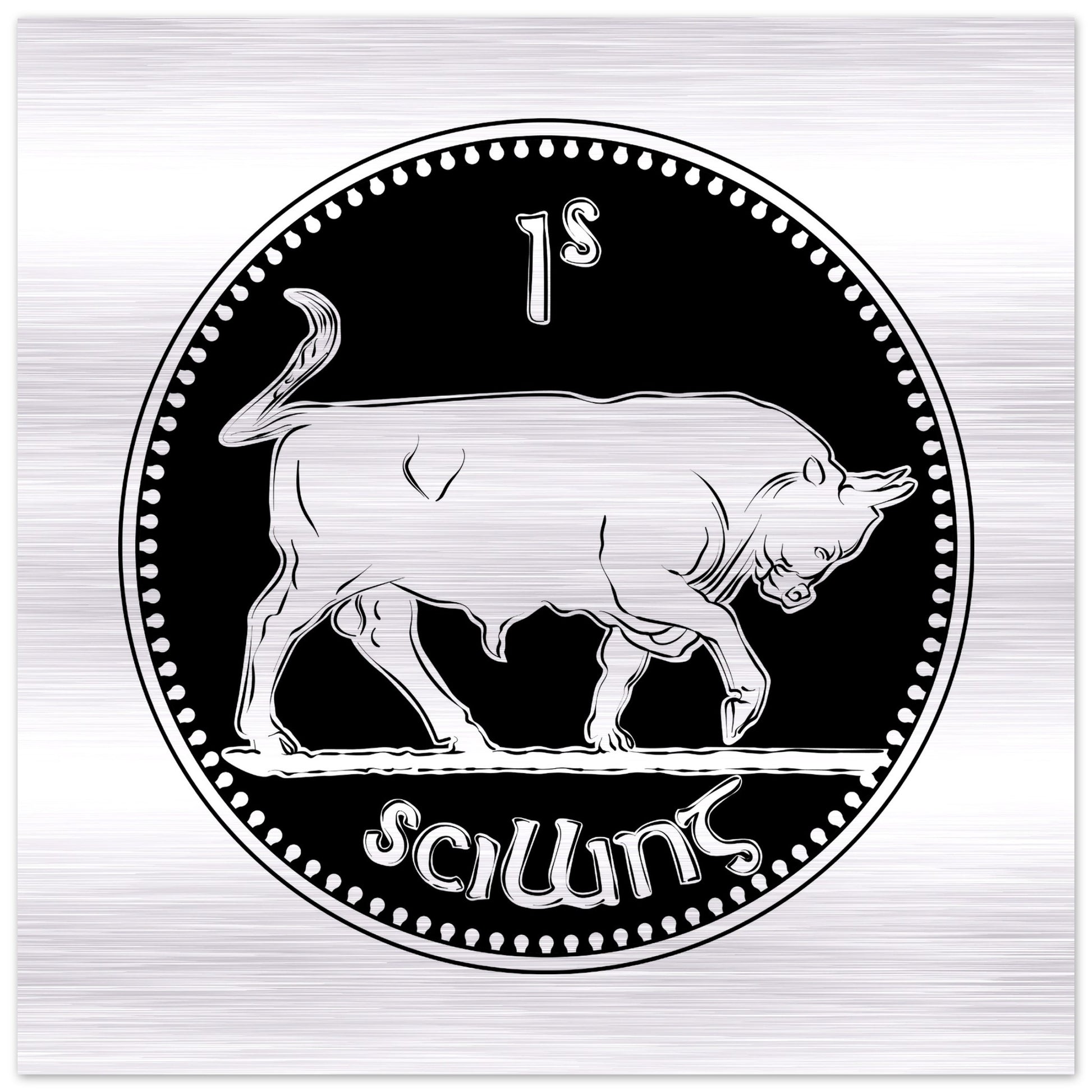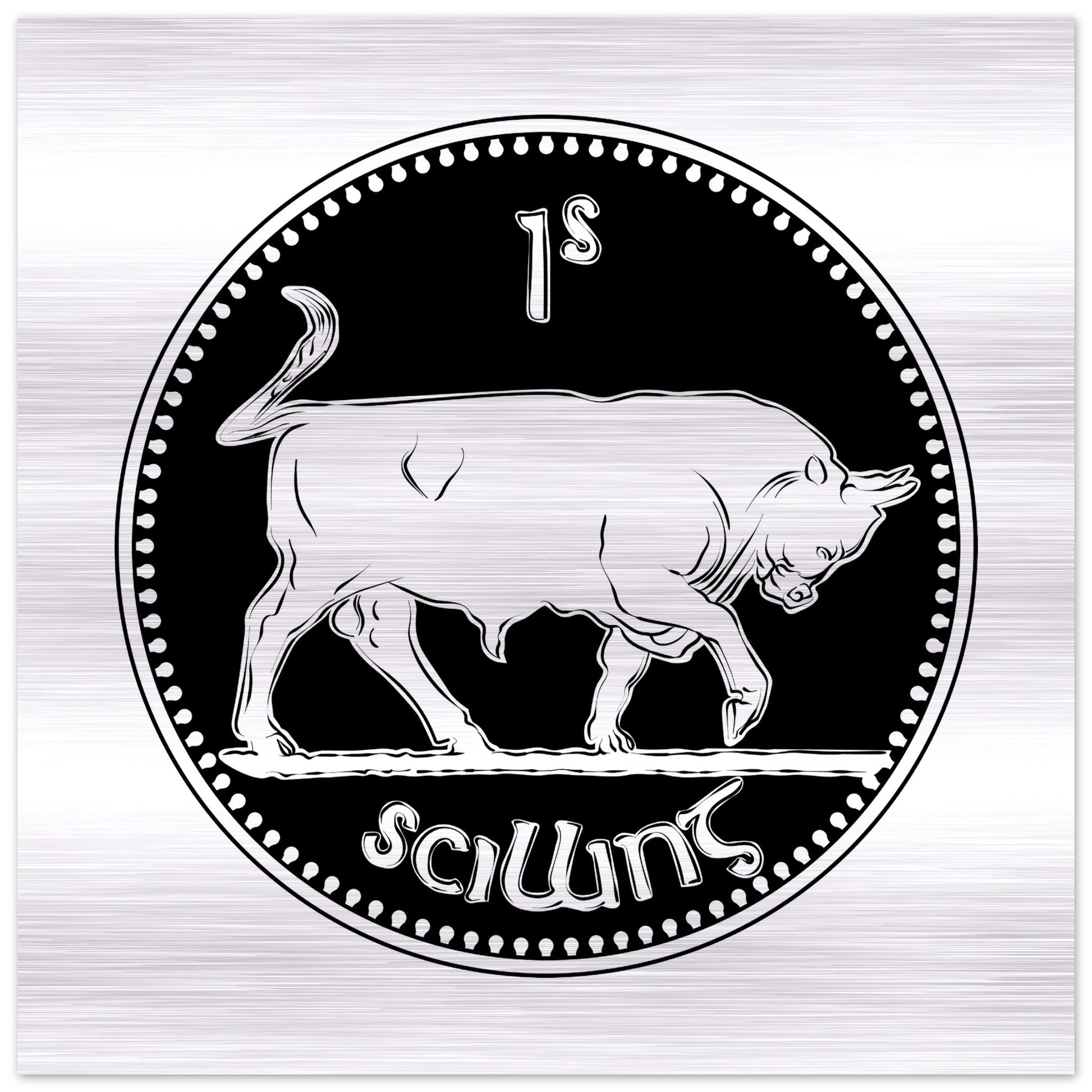 Immerse yourself in Irish history with our Pre-decimal Shilling Coin featuring a majestic bull, now preserved in a mesmerizing brushed aluminum print. Crafted on a silver brushed aluminum DIBOND® panel, known as AluDibond Butler Finish Silver, these prints redefine artistry, infusing depth and texture into every intricate detail.