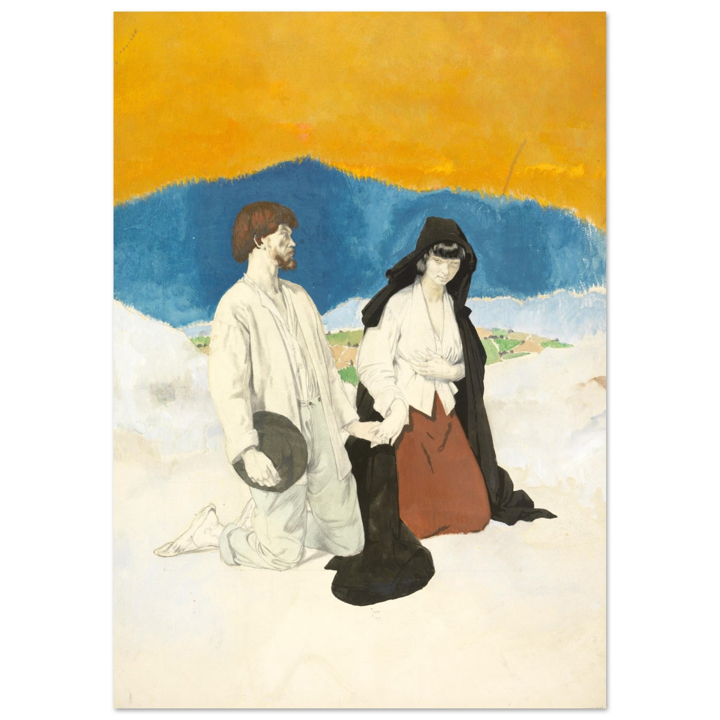 Bring home a piece of lost history with this exquisite reproduction of "Study for ‘The Western Wedding’" (circa 1914), a preliminary drawing by celebrated Irish artist William Orpen. This masterful sketch captures two kneeling figures, delicately holding hands, that were meant to appear in the now-lost painting The Western Wedding—one of Orpen's remarkable allegorical works from his famous ‘Irish Trilogy.’