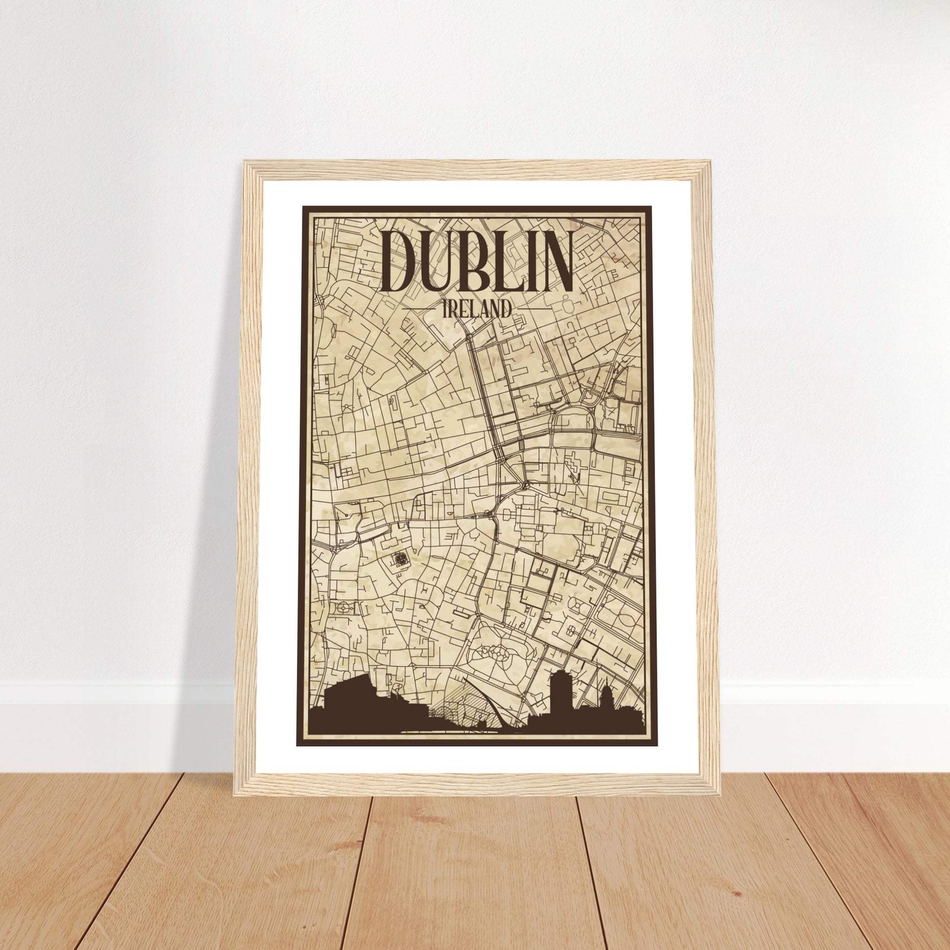 Enhance your wall decor with our stunning framed art print featuring a black printout streets network map of downtown Dublin, Ireland. Against a vintage paper framed background, this piece blends urban sophistication with antique charm. The iconic city skyline adds character and intrigue to any room. Elevate your space with this unique fusion of history and modernity. Perfect for homes and offices, it's a conversation starter that celebrates Dublin's timeless beauty.